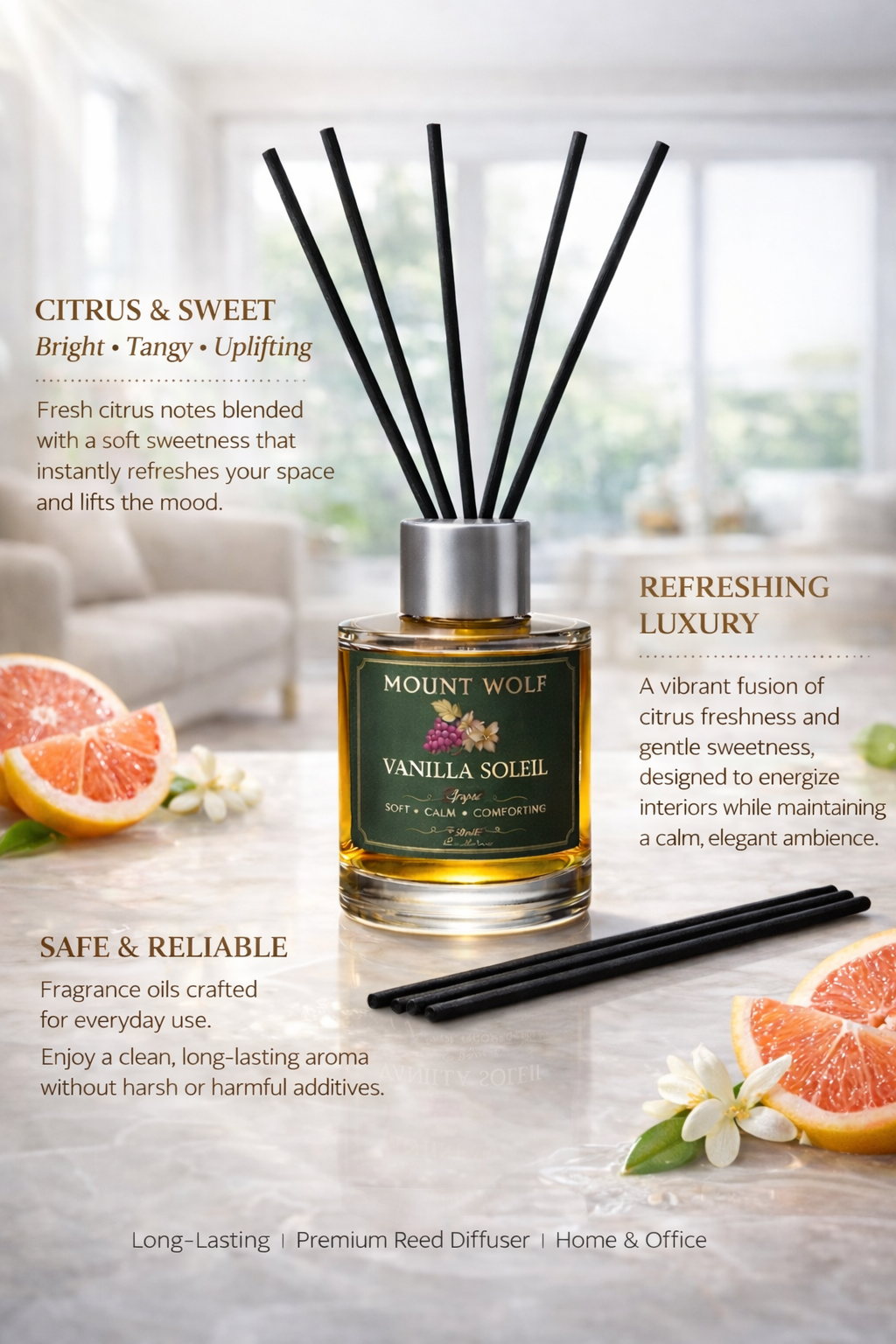 Designed to complement both fragrance and décor, the sleek glass bottle paired with premium 8-inch black fiber reed sticks diffuses a continuous, flame-free aroma. It keeps your space feeling clean, cheerful, and welcoming throughout the day, making it ideal for everyday luxury in small, cozy spaces.